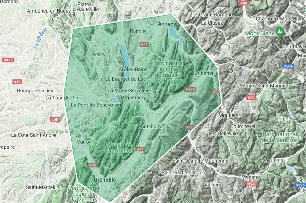 Afin de réduire les déplacements et notre empreinte carbone, nous avons concentré notre énergie sur une partie de la Savoie, de l'Isère et de la Haute Savoie. Nous intervenons principalement auprès des producteurs et des consommateurs dans cette zone.